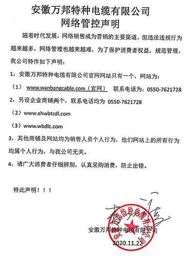 鄭重聲明:安徽萬邦特種電纜有限公司官方網站為:www_wanbangcable_com.enjoykqy.cn,除此之外無任何子網站或合作網站,其余均為假冒偽劣。電話:0550-7621728 13485756353 地 址:安徽省天長市滁州高新技術產業開發區經四路29號